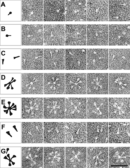 Figure 6: Electron microscopy of F-GCNt and rosette formation. The majority of uncleaved F-GCNt trimers resemble a "ball and stem" (A). These F molecules are ~13 nm in length, and their shape resembles that of the atomic structure of F-GCNt . After cleavage with trypsin, the shape of the trimers was not altered noticeably (B).