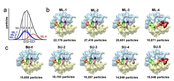 In collaboration with Rachel Green (HHMI, Johns Hopkins University) we have used cryo-EM and classification to investigate such a sample. We found at least two distinct conformations and tRNA-binding configurations, distinguished by the presence or absence of the ratchet motion and by the positions of the tRNAs (classical versus hybrid; Figure 3). A recent reanalysis of the same data set with an improved classification method resulted in the discovery of a well-populated intermediate state, as well.