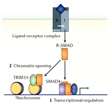 In embryonic stem cells, we recently discovered that RSMADs form a complex with the histone-binding protein TRIM33. Signal-driven RSMAD-TRIM33 binds to repressive histone marks on master differentiation genes, relaxing their poised chromatin to enable companion RSMAD-SMAD4 complexes to trigger transcription. The lab is currently defining the specific mechanism and regulatory implications of this process, both in embryonic and in adult stem cells.