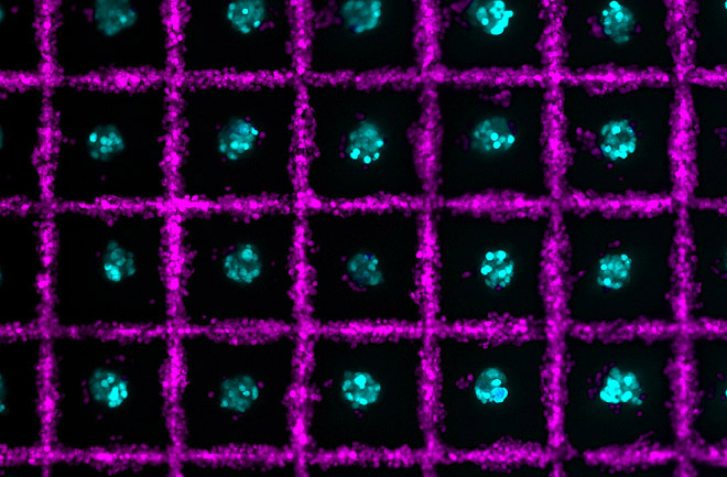 Specifically, our group has explored the use of electromagnetic fields (electrophoresis [DC] or dielectrophoresis [AC]), miniaturized optical tweezers, photochemistry, patterned surface chemistries, robotic spotting, microfluidic droplet encapsulation, and microfabricated wells—all to array living cells for parallel observation. We have developed projects to utilize these tools to understand a variety of phenomena, including differentiation of pluripotent stem cells in combinatorial microenvironments, the role of 3D cell organization on tissue function, and the dynamics of cell-cell interaction using reconfigurable silicon MEMS (micro-electro-mechanical systems).