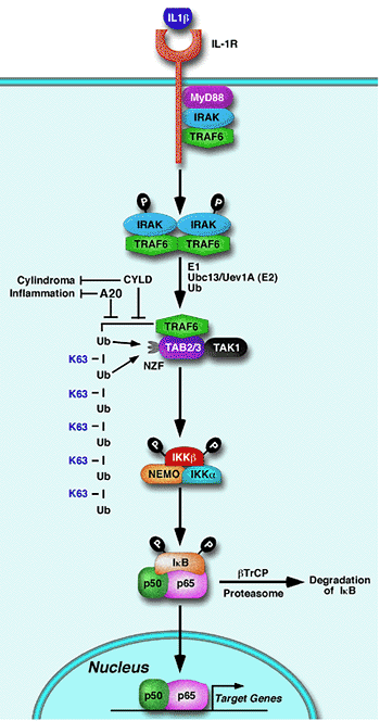 Further studies showed that TAB2 and its homolog TAB3 contain a highly conserved zinc finger domain known as the NZF domain, which binds preferentially to K63 polyubiquitin chains, and that this binding is required for TAK1 activation. After TAK1 is activated, it phosphorylates IKKβ at two serine residues within the activation loop, leading to activation of the IKK complex. We also identified a novel ubiquitin-binding domain (NUB) in NEMO, the essential regulatory subunit of the IKK complex. This domain and another zinc finger-type ubiquitin-binding domain at the carboxyl terminus of NEMO mediate specific binding to K63 polyubiquitin chains, which recruit IKK to the TAK1 complex, facilitating the phosphorylation of IKK by TAK1. We have recently developed a ubiquitin replacement strategy in human cells and demonstrated that K63 polyubiquitination is essential for IKK activation by IL-1β.