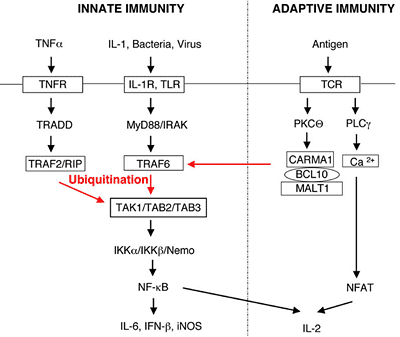 In the course of studying the regulation of IKK by TRAF6, a protein essential for NF-κB activation by interleukin-1 (IL-1) receptor (IL-1R) and Toll-like receptors (TLRs), we identified two factors that mediate IKK activation by TRAF6. One of these factors is a ubiquitin-conjugating enzyme (E2) complex consisting of Ubc13 and Uev1A, and the other is a protein kinase complex containing TAK1, TAB1, and TAB2. We found that TRAF6 functions as a ubiquitin ligase (E3) that, in conjunction with the Ubc13-Uev1A complex, catalyzes the synthesis of a unique polyubiquitin chain linked through lysine-63 of ubiquitin. This K63 polyubiquitination activates the TAK1 kinase complex through a proteasome-independent mechanism.