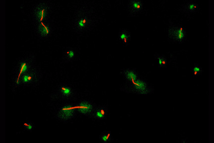 Figure 6: Protein phosphatase Cdc14 is released from the nucleolus during anaphase. Cdc14 (green) is localized to a discrete subnuclear domain (the nucleolus) during interphase, when cells contain either a single microtubule-organizing center or a short microtubule spindle (tubulin, red). In cells that have a long microtubule spindle indicative of late anaphase, Cdc14 is dispersed throughout the cell.