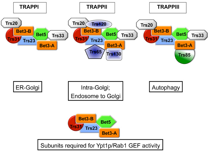 Ypt1 and its mammalian homolog Rab1 regulate endoplasmic reticulum (ER)-Golgi traffic, Golgi traffic, and autophagy. TRAPPII- and TRAPPIII-specific subunits target TRAPP complexes to different cellular locations where, in combination with other factors, they mediate a specific membrane tethering event. Mutations in TRAPPI gene products block ER-Golgi traffic, while mutations in TRAPPII-specific gene products block Golgi traffic. Loss of the TRAPPIII-specific subunit Trs85 leads to a defect in autophagy in both yeast and mammalian cells.