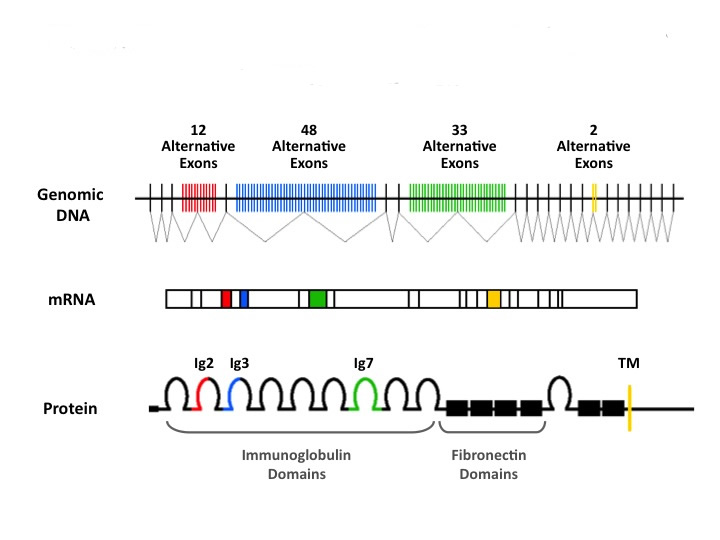 The Dscam1 gene is alternatively spliced to give rise to a vast number of different isoforms. Dscam1 proteins are single-pass transmembrane proteins of the immunoglobulin (Ig) superfamily. Each isoform shares the same domain structure but differs in amino acid sequences within three variable Ig domains (Ig2, Ig3, and Ig7; indicated in colors red, blue, and green, respectively).