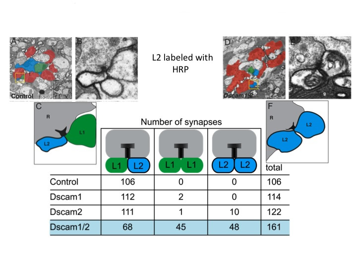 Using serial EM reconstruction, the Zipursky lab sought to assess whether Dscam1 and Dscam2 play a role in tetrad assembly. Surprisingly, these two genes act in parallel and in a largely redundant fashion to prevent inappropriate pairing of L1 and L2. The L1 postsynaptic elements are from the same L1 cells; this is also the case for pairs of L2 postsynaptic elements. Horse-radish peroxidase (HRP) was expressed as a transgene selectively in L2 to aid in identifying the L2 axon. It produces an electron-dense precipitation along the membrane. R, photoreceptor cell axon.