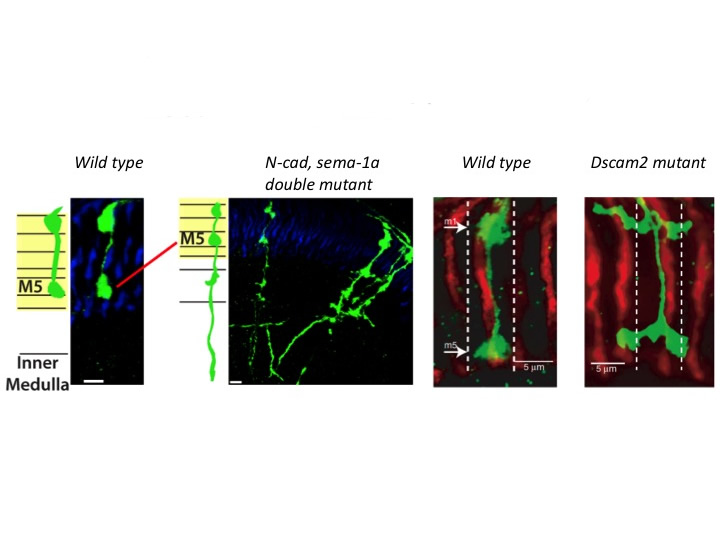 Two left panels: in wild type, L1 axons terminate in the M5 layer of the medulla. In the absence of both N-cadherin and Semaphorin-1a, L1 axons extend beyond M5 into deeper regions of the visual system. N-cadherin mediates binding between L1 and other axons within M5, and Semaphorin-1a acts as a repulsive receptor for Plexin A, acting as a ligand, expressed in neurons in the layer just below M6.