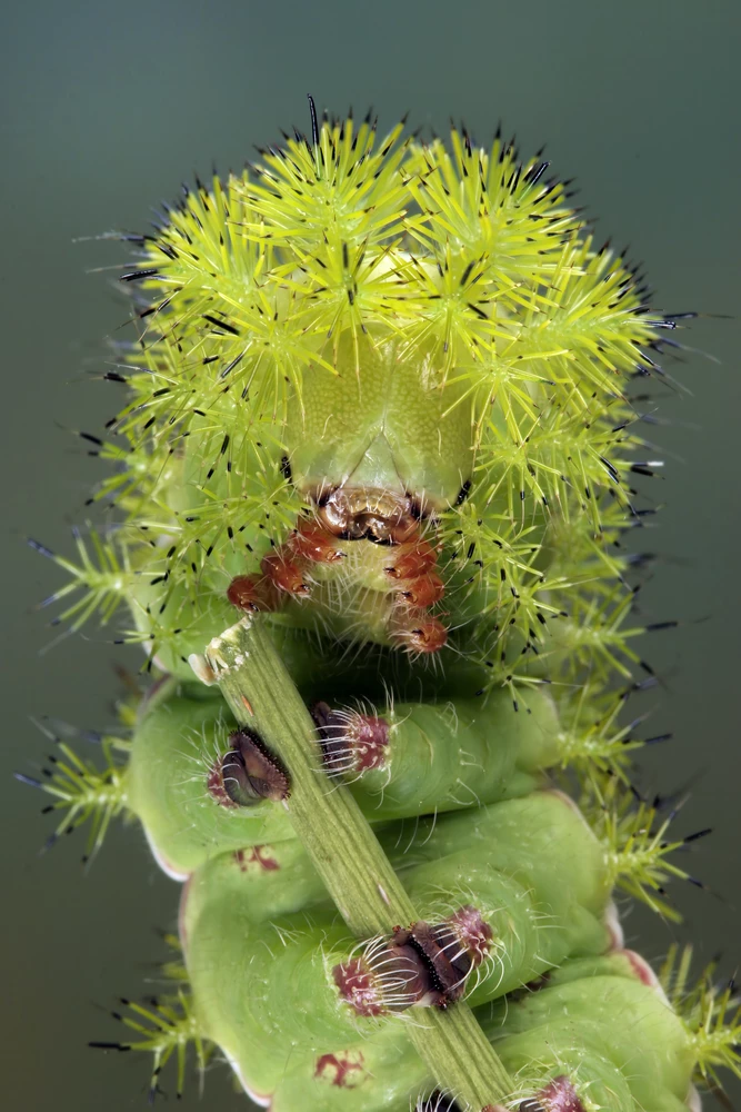 You might conclude that this peacock moth caterpillar is having a bad hair day. But that array of green and black spikes has a purpose – to protect the creature from predators, by packing a mean sting.