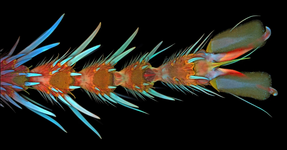 This is the foot, or tarsal pad, of a robber fly, followed by several of the tarsal segments (also called tarsomeres) that make up the final segment of a robber fly’s leg. You can see spiky bristles along the leg (1); adhesive, Velcro-like pads covered in flexible, hair-like setae (2); and two hooked claws at the end of the foot (3) – all of which help robber flies catch and grasp other insects.