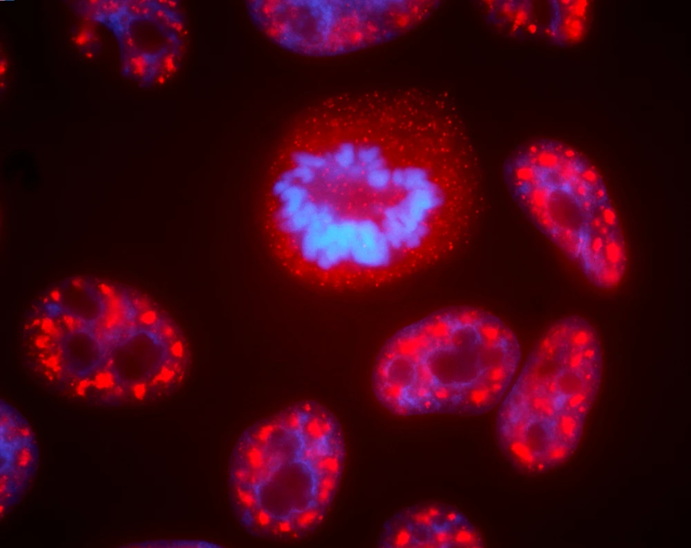 This is a fluorescent image of several nuclei from individual cells. The DNA is light blue (1). RNA-processing proteins that are embedded in the nuclear envelope (the membrane around the nucleus) are red (2).