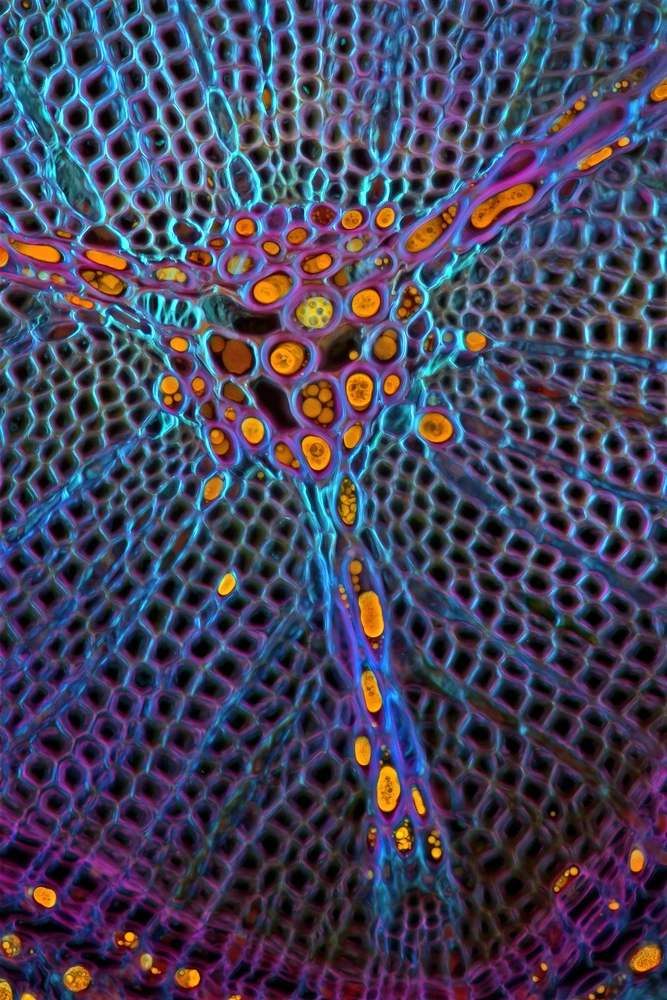 This is a cross section of a young shoot on a cedar tree (a member of the genus Juniperus). The web-like pattern radiating from the center of the image is created by the cell walls of xylem cells (1). The structure at the center of the image is the pith (2). The pith’s role is the storage and distribution of nutrients throughout the tree. The three vascular, or pith, rays (3) are responsible for radial conduction of water, minerals, and nutrients. And the orange ovals are grains of starch (4), where the plant stores energy.