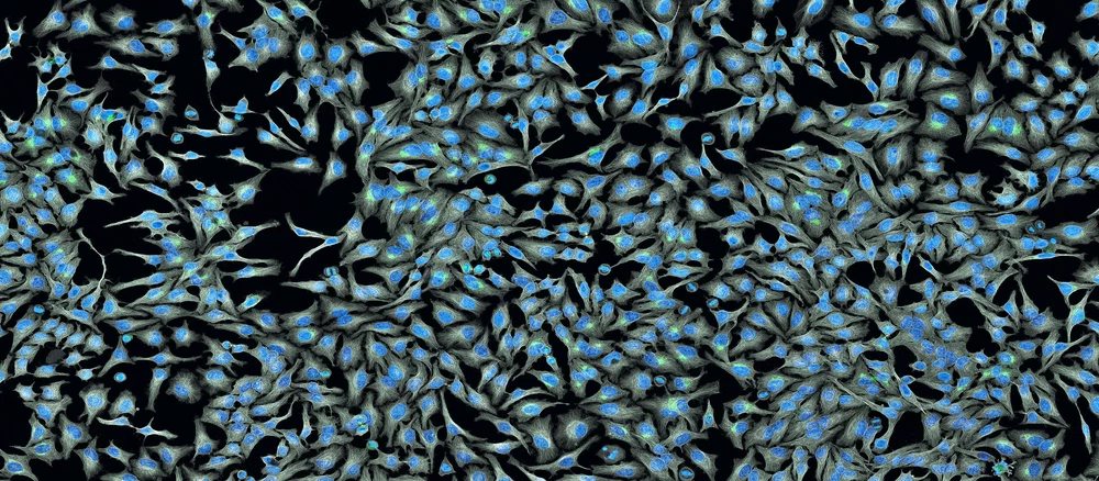 This is a collection of over 300 HeLa cells. They’re from a famous cell line derived from a woman named Henrietta Lacks, who died in 1951. Her cells have led to numerous significant medical findings because, unlike most human cells, they continue to divide forever. This allows for an unlimited supply of similar cells for research purposes.