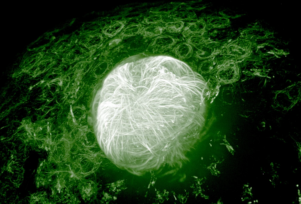 This is an image of the network formed by microtubules within the cells that make up the lens in the eye of a zebrafish embryo, plus its surrounding tissues. The microtubules shine green in this image, and the density of the microtubules is indicated by the intensity of the green coloring. Darker green indicates low-density areas (1) and lighter green/white indicates high-density areas (2).