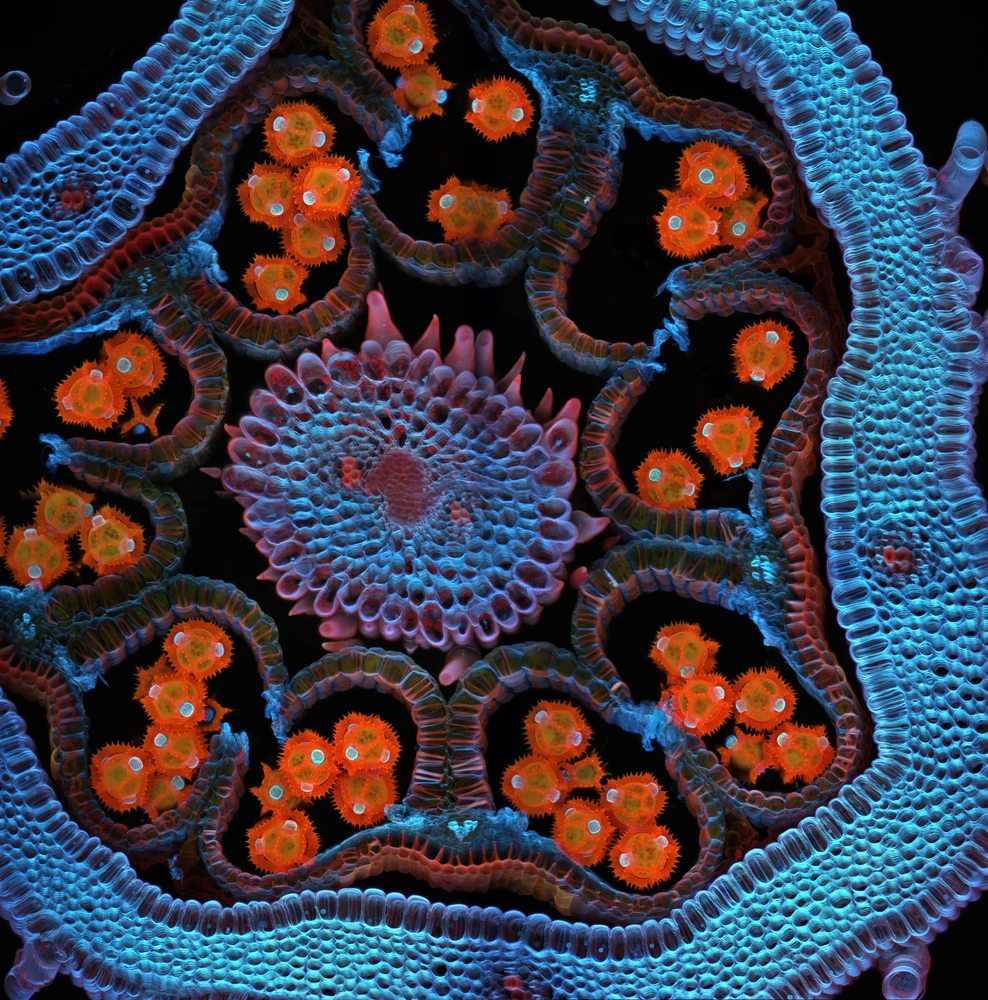 This is a cross section through a developing floret of a chicory flower (Cichorium intybus). The orange pollen grains (1) are contained within four pollen chambers (2) that are inside each of five anthers. You can see in blue the cell walls (3) of the individual cells that make up the floret. A cross section of the stigma (4) is visible in the center of the image.
