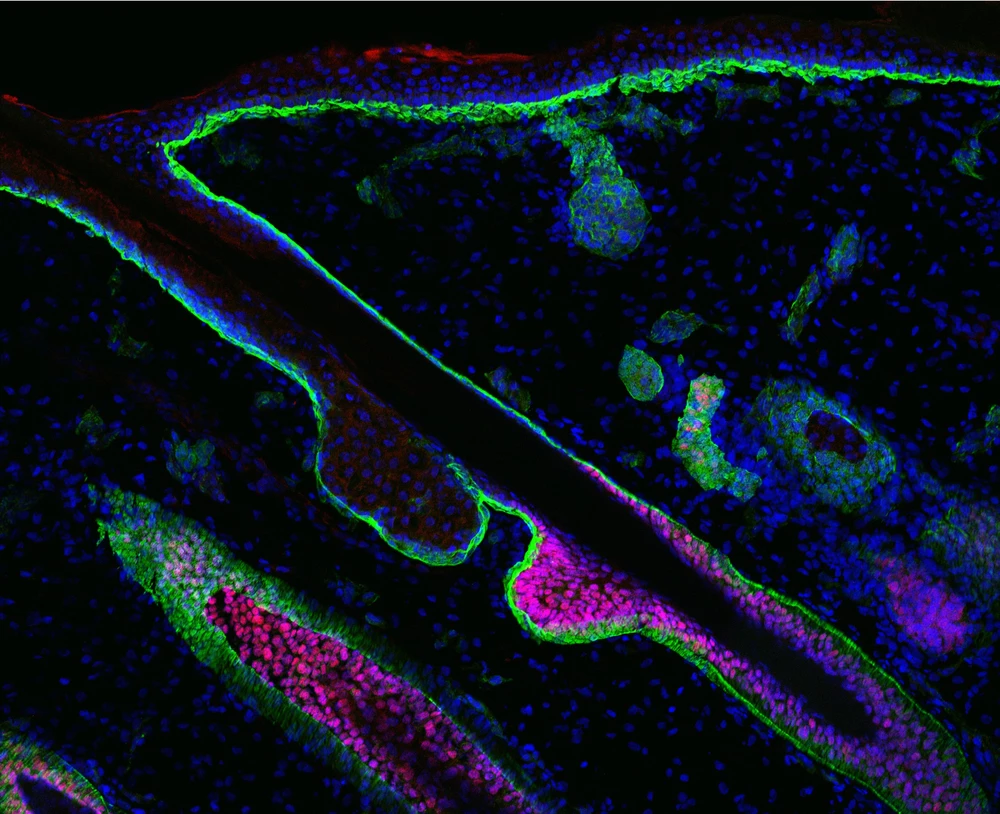 This is a fluorescently labeled section of embryonic human skin. The dark, diagonal slash through the center of the image is a hair follicle (1). The pink areas are stem cells in the hair follicles that will eventually grow hair (2). The developing bud of a sweat gland can be seen as a bulb of blue and green near the top of the image (3). The nuclei of all the cells are shown in blue (4). And the green line is the basement membrane of the epithelium – the supporting structure that skin grows on (5).