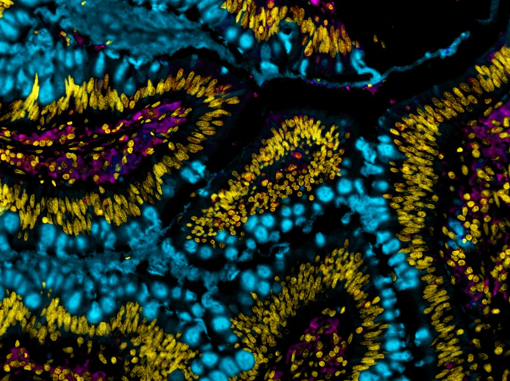 This image shows tissue from the small intestine of a mouse. The blue spots are goblet cells (1). The purple spots are immune cells like macrophages, which fight invading pathogens (2). The yellow dots represent the nuclei of the cells in the surrounding tissue (3).