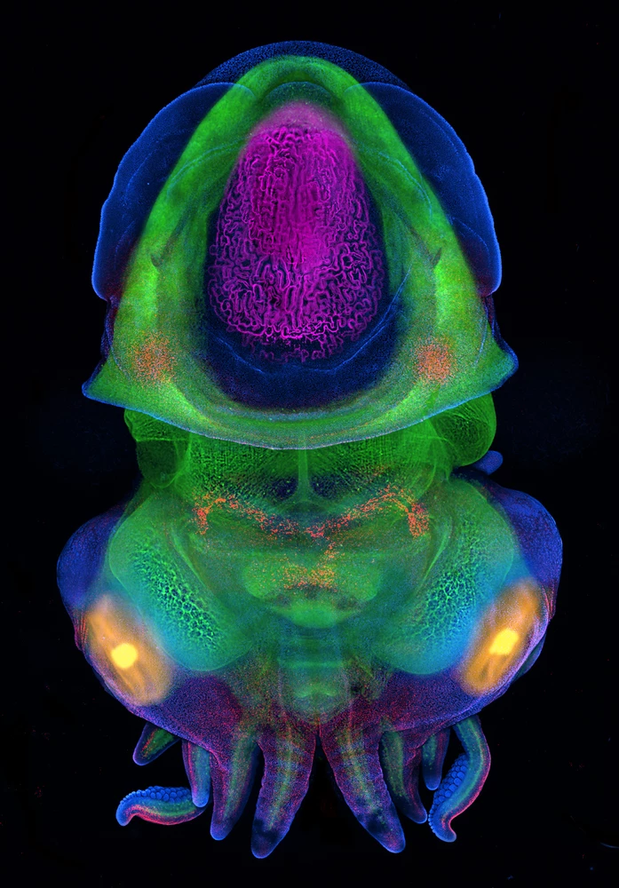 This is a fluorescently stained embryo of a dwarf cuttlefish. Its eyes are yellow (1). Its developing muscles and nervous system are green (2). A subset of neurons in its brain, in two patches of epithelial cells in its mantle, and in its arms are red (3). Its “cuttlebone,” an internal shell that acts like a skeleton and helps it control its buoyancy, is purple (4). And the nuclei of all the cells are blue, making the remaining unlabeled tissue blue (5).