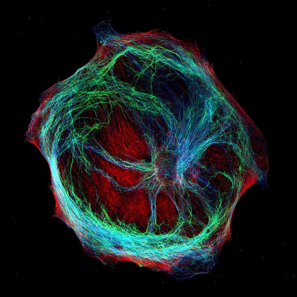 The cytoskeleton gives cells their structure and allows them to move. This image shows two important components of the cytoskeleton. The blue and green fibers (1) are microtubules, the cell’s molecular highways. Cellular components travel along microtubules to reach their destinations within the cell. While microtubules are important for movement within the cell, the red in this image (2) highlights the protein myosin, which is integral to the movement of the cell itself. This protein attaches to a different part of the cytoskeleton called actin filaments. It can push and pull these filaments, which are attached to the edge of the cell, resulting in locomotion.
