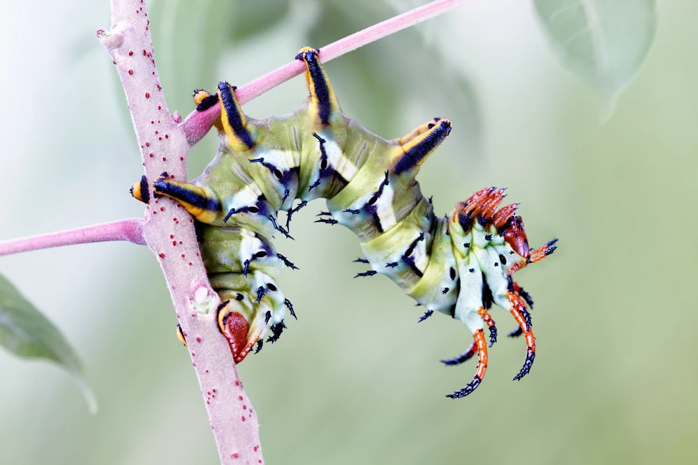 This hickory horned devil caterpillar is doing some acrobatics while eating the leaf of a tree. These caterpillars get their name from the bright red and black face and horns adorning the thoracic segments behind their head.