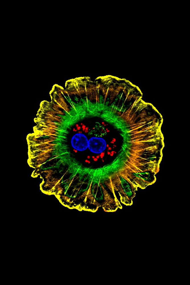 This is a single human hepatocyte. Its two nuclei are in blue (1). The other colors in this image are stains of the actin protein and are depth-coded, with red being the closest to the viewer, then green, then orange, and finally yellow being the farthest from the viewer.