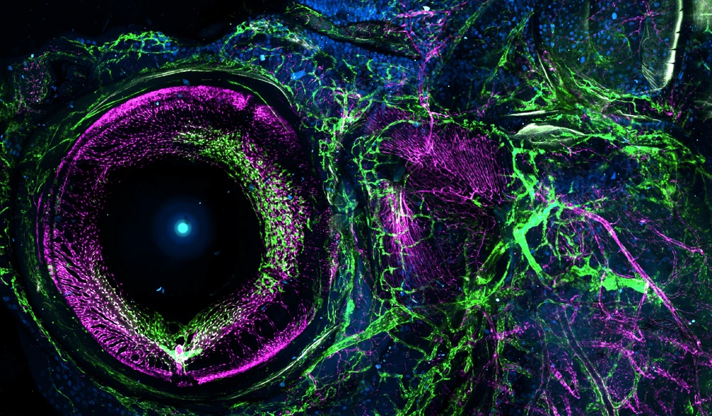 This image looks as if it could be the cover of a science fiction novel. It shows blood and lymphatic vessels in and around the eye of a zebrafish. Understanding how these systems develop in zebrafish can help researchers better understand and treat eye diseases in humans.