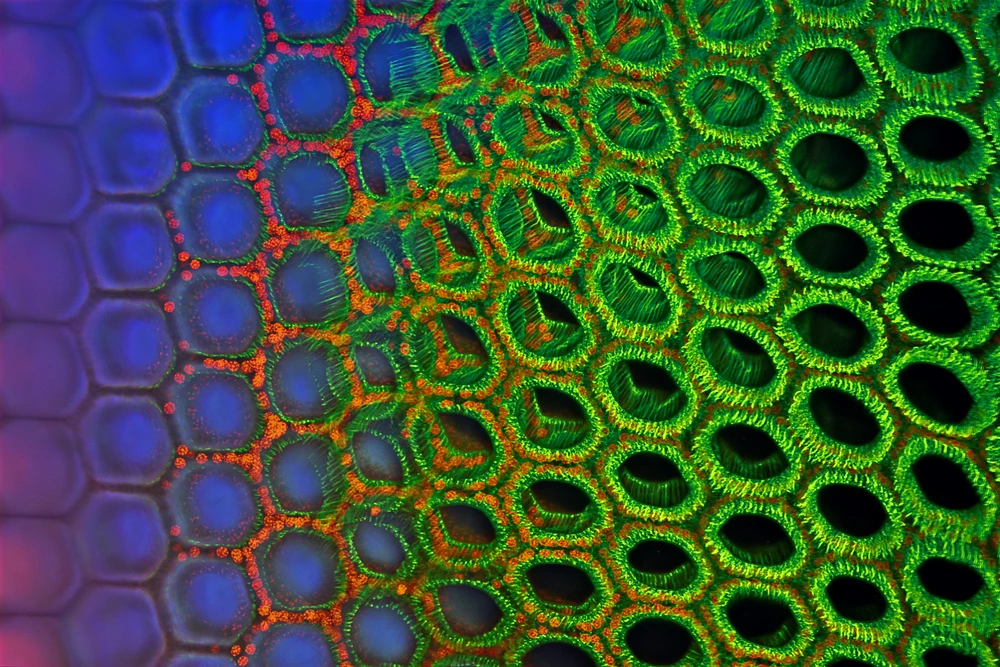 These images show several views of the repeating units, called ommatidia (1), that make up the eye of a dragonfly. The colors you see in these images are the result of a process called fluorescence, which happens when you shine a laser onto a sample under a microscope. Different structures in the sample are stained different colors – the protein actin is green (2), the nuclei are red (3), and the chitin is blue (4).