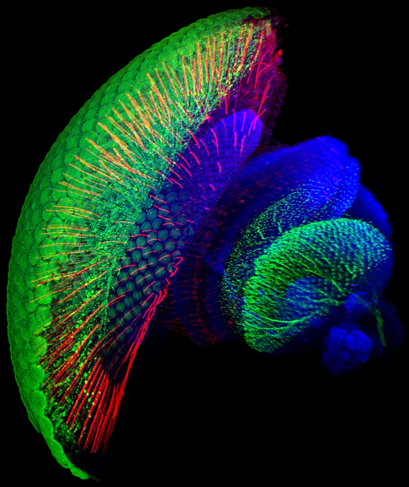 The fruit fly eye is considered compound because it has many small chambers laid out on a convex (curving outward) surface; each chamber can sense light. The optic lobe is the part of the brain that synthesizes and processes the visual information that’s gathered by the eye. As you can see in this image, a fruit fly’s optic lobe is located very close to the eye itself, whereas the optic lobe of a human is located all the way in the back of our brain, almost as far away from our eyes it could get.