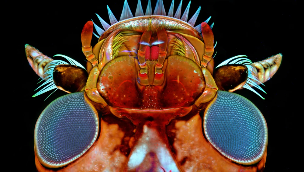 This is a ventral view (that is, of the underside) of the head of a whirligig beetle (a member of the family Gyrinidae). These beetles are highly adapted to living at the interface of air and water; their four paddle-like legs make up one of the most efficient propulsion systems in nature. And to enable them to see both above and below the water’s surface, they evolved split compound eyes. In this image, you can see the beetle’s large ventral eyes (1), its mandibles (2), and its antennae (3) sticking out on either side of its head. The coloration is a combination of autofluorescence (colors generated when a laser shines on a sample) and of the red and blue fluorescence of Congo red and Calcofluor white dyes.