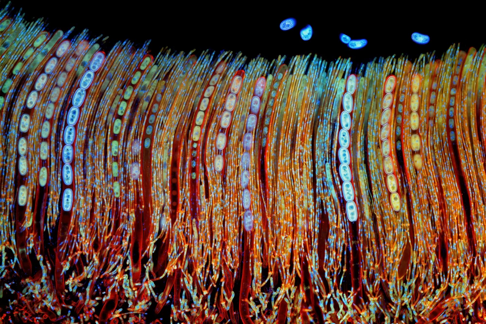 The species’s spores (known as ascospores) come in eights. They are the product of two haploid nuclei (that is, nuclei that each contain a single set of chromosomes) fusing in the ascus to form a diploid nucleus (that is, with two sets of chromosomes). That nucleus then undergoes meiosis to produce four haploid nuclei, which divide by mitosis to create eight nuclei.