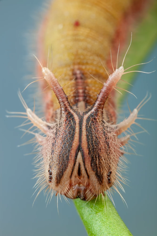 This is the head of the caterpillar of an Automedon giant owl butterfly (Eryphanis automedon) walking along a bamboo stem. You can see its six pairs of simple eyes, or ocelli (1), and its chewing mouthparts, or mandibles (2).