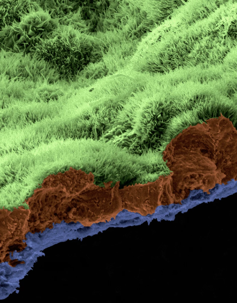 Here we see three RPEs with their cell bodies in brown (1) grown on a biodegradable scaffold in blue (2) and projections (small tendrils) emerging from the top of these cells in green (3).