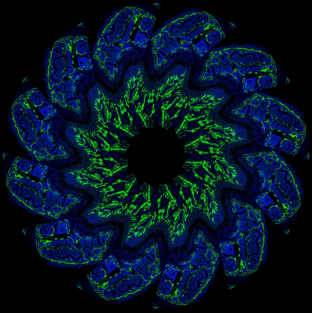 This is an arrangement of a growth plate from the femur of a two-week-old mouse. The image is repeated 12 times to create the blossom shape. New bone growth is stained green (1) and the nuclei of the surrounding cells are stained blue (2).
