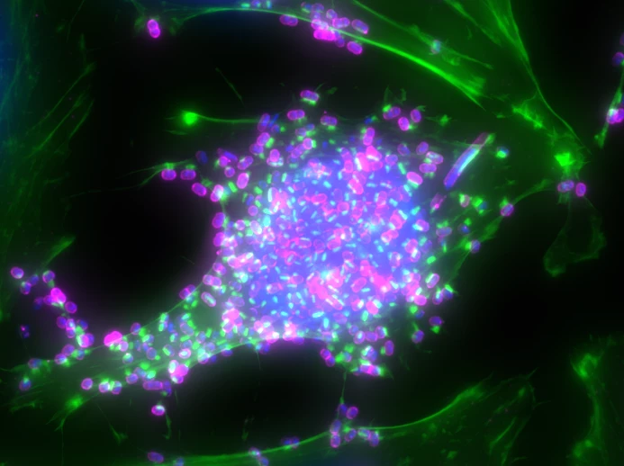 This is an image of fluorescently labeled enteropathogenic Escherichia coli bacteria – commonly referred to as E. coli – that have infected a human cell. The bacteria are pink/purple (1). The actin protein in the cell’s cytoskeleton is green (2), and the nucleus of the cell is the large blue sphere in the center of the image (3).