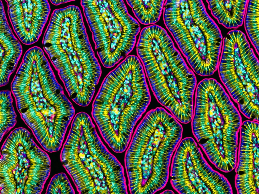 While this image might look like a multicolored tile floor, it is actually a cross section through the fingerlike bumps on the intestinal wall called villi. The cells within the villi, which you can see here as multicolored circles within the purple or blue outlines, are very important for the proper function of the intestine as a whole.