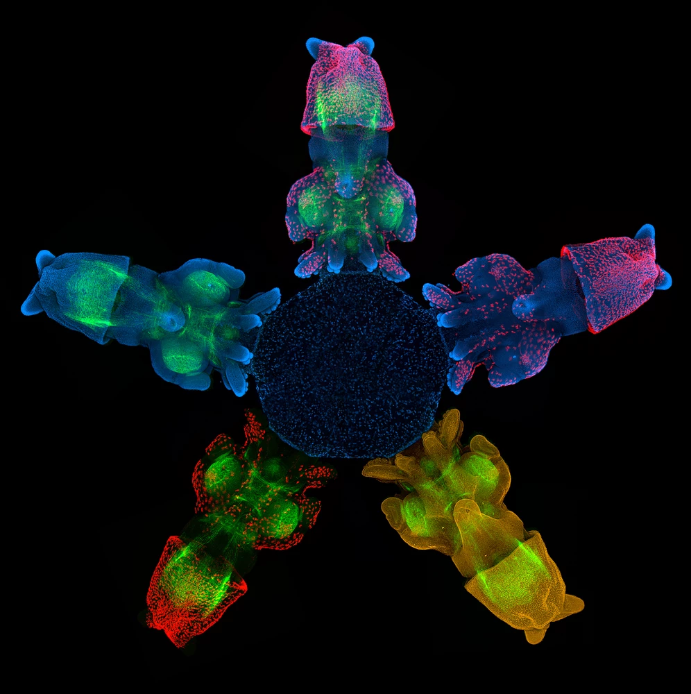 This is a composite image of five individual embryos of Loligo pealei squid, with their yolk sacs aligned in the center. Each squid displays a different combination of fluorescent markers. The nuclei of all the cells are blue dots (1). F-actin, a fibrous protein in the embryos’ neural structures, is green (2). Acetylated tubulin, in the cilia on the surface of the embryos, is red/pink (3). And beta-catenin, a molecule that aids in developmental signaling, is yellow (4).