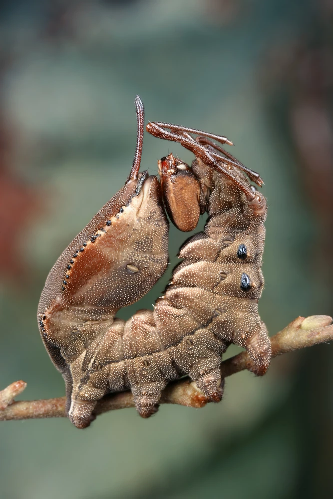 These caterpillars have a peculiar and unusual defensive strategy; when disturbed, they raise their swollen abdomen and the front of their body up and unfold their four exceptionally long – for a caterpillar – forelegs. They kick their legs at the foe and intermittently shake them vigorously. When viewed from above, this caterpillar resembles a giant ant or a spider. It is disputable exactly what effect it’s trying to achieve. But whatever it is mimicking, it probably isn’t a lobster!