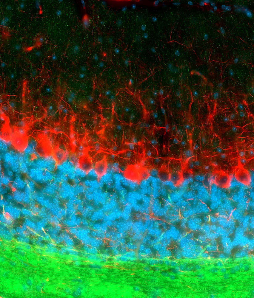 This is a cross section through the three layers of a mouse’s cerebellar cortex: the molecular layer is red (1), the so-called Purkinje layer is blue (2), and the granular layer is green (3). The red ovals at the junction between the molecular layer and the Purkinje layer (4) are the neuronal cell bodies of Purkinje cells. The red lines above those cell bodies (1) represent the dendrites extending from the Purkinje cells; the dendrites branch into a tree-like arrangement in the molecular layer.