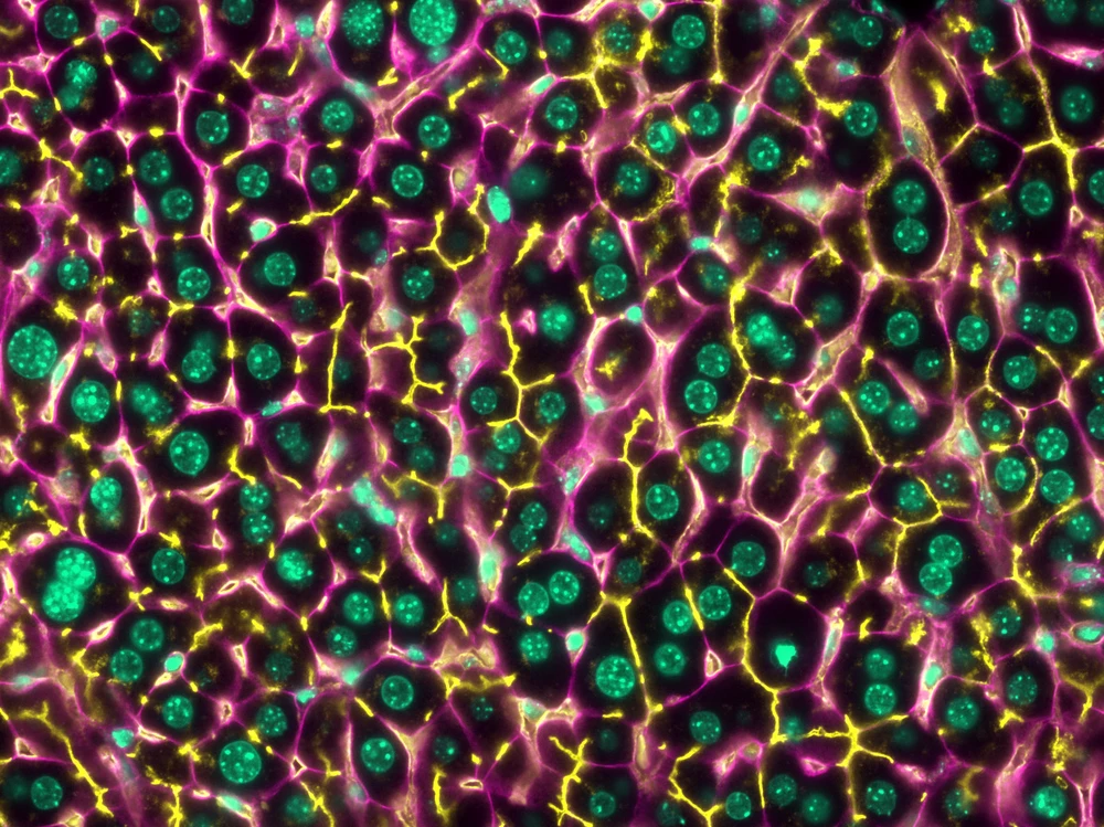 These are mouse liver cells. Liver cells have one or two large circular nuclei, shown in green (1). Each cell contacts the neighboring cell’s blood vessels, shown in pink (2). The yellow structures you see between the cells (3) are pumps and ducts that transport substances made in the surrounding liver cells to the rest of the body.