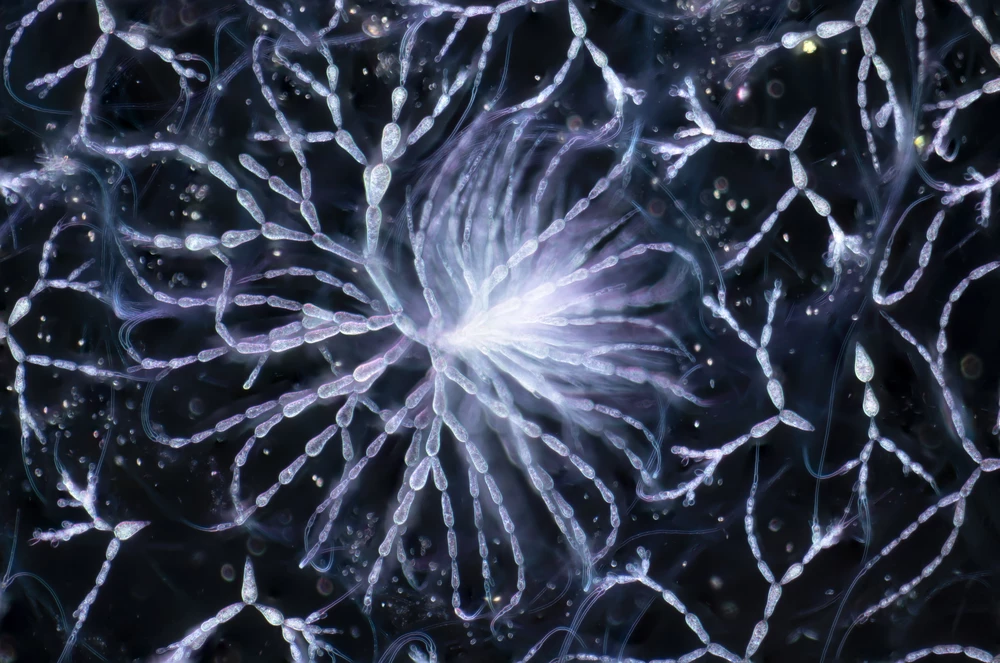 This spiraling pattern of glowing strands is a sample of freshwater red algae. These algae are common and are found on all continents except Antarctica.