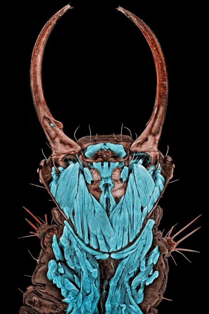 This is a dorsal (from the top, looking down) view of a cross section through the head and mandibles of a green lacewing larva (a member of the Chrysopidae family). The muscles are blue (1). It doesn’t have what we would consider a mouth. Instead, its sickle-shaped mandibles (2) inject a combination of paralyzing venom and digestive enzymes into its prey and then deliver the prey’s liquified innards back into the larva’s mouth cavity. You could think of the mandibles as being a mash-up of a hypodermic needle and a drinking straw!