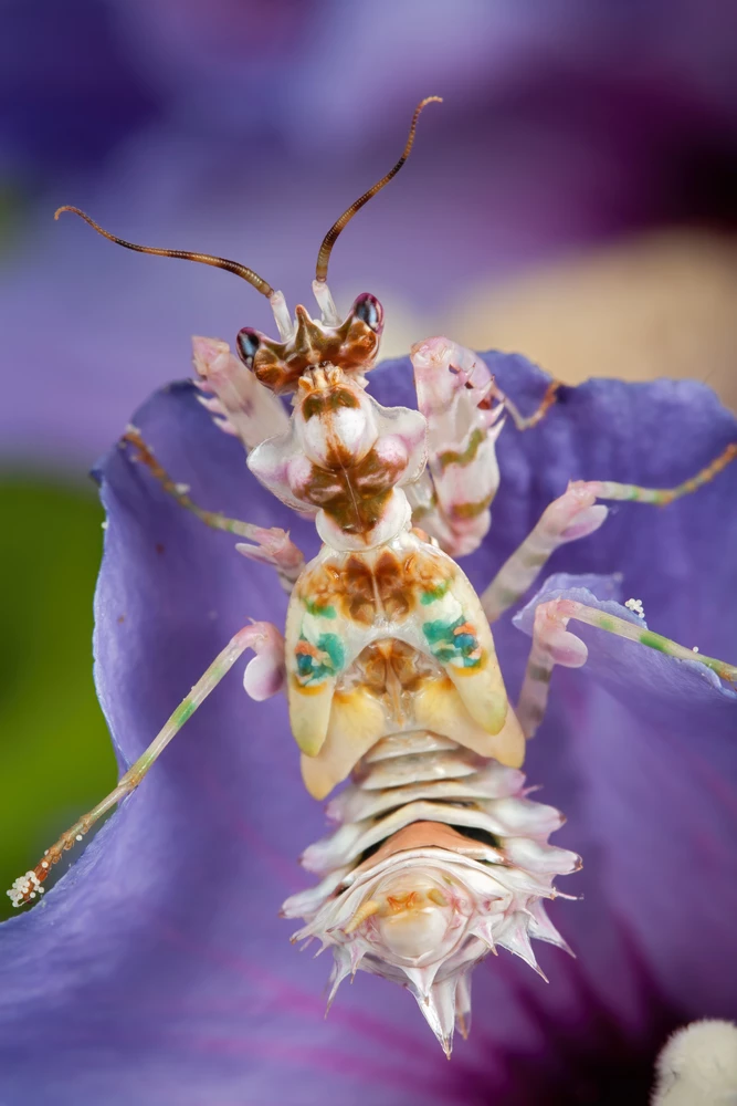 This colorful baby mantis is about to transform into an adult. The species is known as the number nine mantis because the pattern on its forewings in its adult stage looks like a numeral “9.”