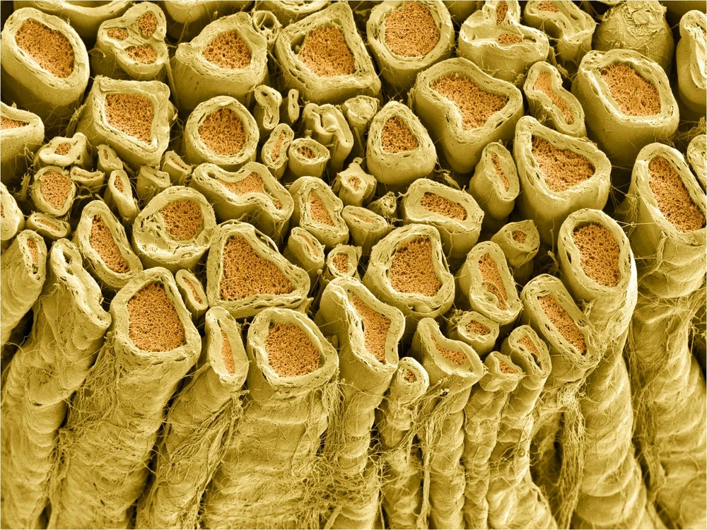 What would you see if you cut through an electrical cord? Insulation around the outside and tiny metallic wires stuffed in the middle. The structure of the axons in the nervous system is very similar. This is a glimpse of the severed ends of some axons from the spinal nerve of a rat. Each axon is wrapped in myelin – a fatty sheath that acts like an electrical insulator for the signals that these axons carry.