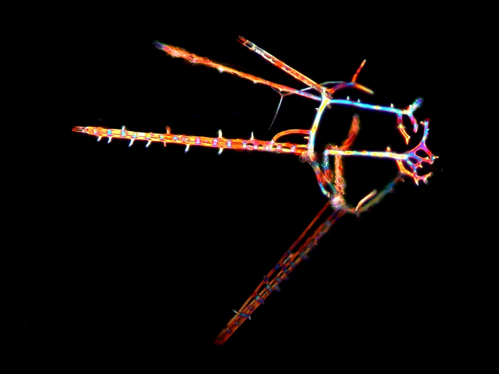 This is the skeleton of a sand dollar larva under cross-polarized illumination. The skeleton is made of a single crystal of calcite, which is optically active, meaning it can rotate a plane of polarized light to the right or left. This change in the plane of polarized light results in the colors visible in this image.