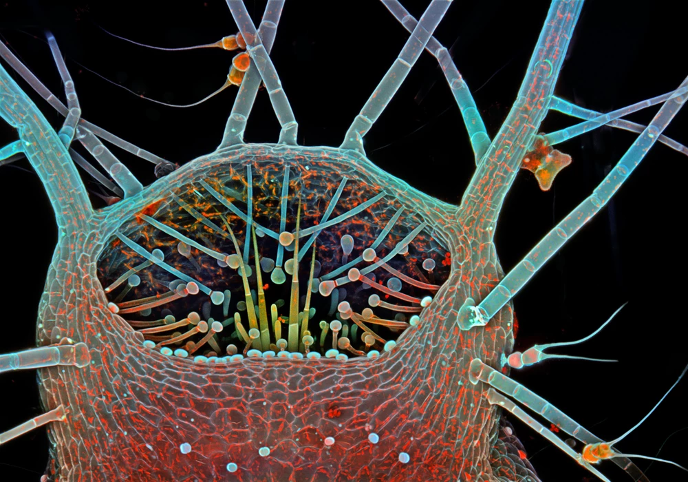 These images show the entrance leading into the trap, or bladder (1), of the aquatic bladderwort plant. You can see several long bristles encircling the trap (2); these bristles guide food into the trap. The hairlike structures, or trichomes (3), in the middle of the trap’s entryway, or valve, serve as a trigger to spring the trap whenever an aquatic invertebrate touches them. The colors in these images are a combination of autofluorescence (colors generated when a laser light interacts with certain molecules within a sample, which is a key step in confocal microscopy), and a red and white stain applied to the plant.