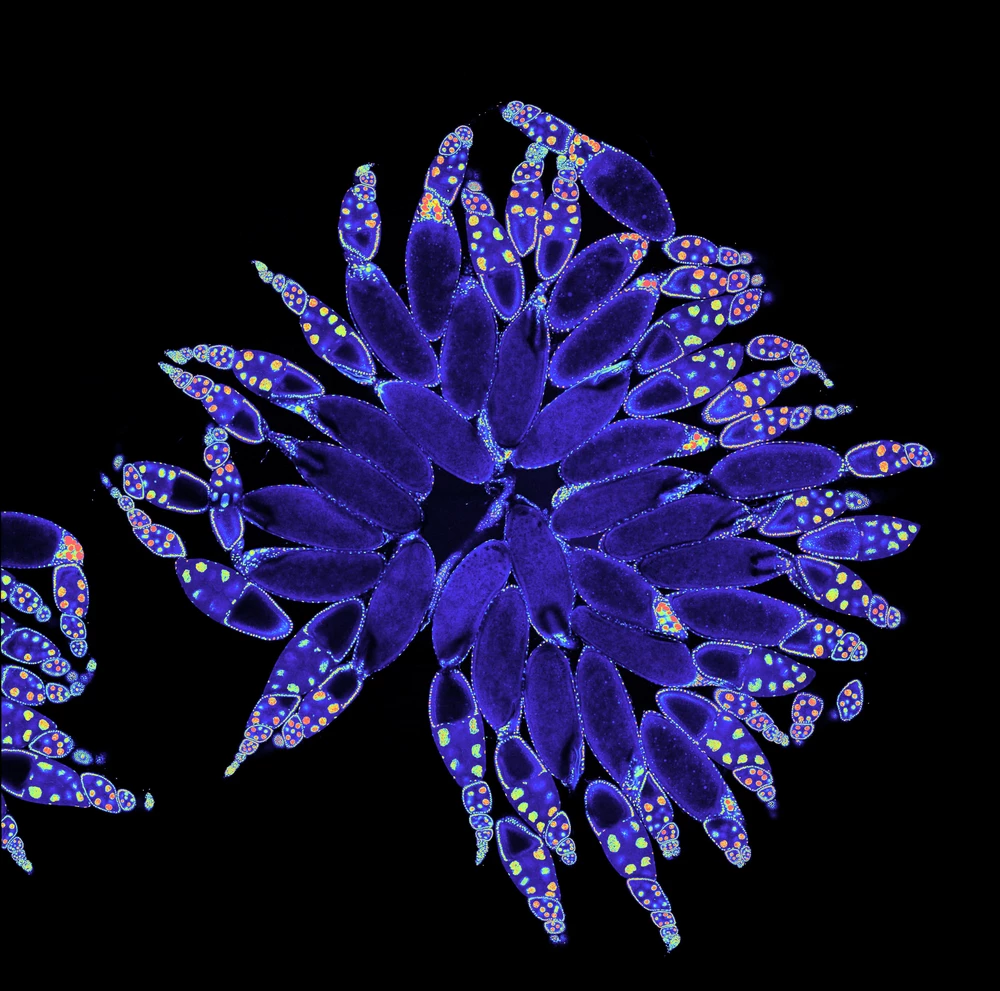 This is an image of a fluorescently labeled fruit fly ovary, composed of multiple ovariole strands, each containing multiple developing egg chambers. The eggs are dark blue/purple (1), and the nuclei of the nurse cells are red, green, and yellow (2).