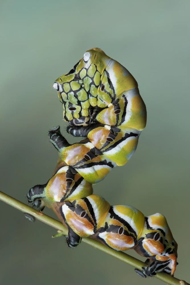 This is the caterpillar of a Hearsey’s owl moth (Brahmaea hearseyi) as it rears up to make itself look bigger and display its eyespots to potential predators. You can see its head (1) curled downward, and its segmented true legs tucked under its head (2). Its fleshy prolegs, each terminating in a row of hooks called crochets (3), are very prominent in this species.