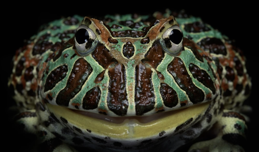 This is a Pac-Man frog (Ceratophrys stolzmanni), also known as a Pacific horned frog, Pacific big-mouthed frog, Stolzmann’s horned frog, or Ecuadorian horned frog. You can see its eyes (1) and the small “horns” above them; its large mouth (2); and the distinctive green, brown, and red pattern on its skin (3).