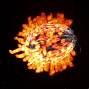 This looks like it might be a slow-motion image of a firecracker going off, but it’s actually a single cell captured during the prometaphase stage of cell division. During prometaphase, the cell’s DNA is compacted into chromosomes, which are attached to microtubules so the DNA can be pulled into each daughter cell later in the process.