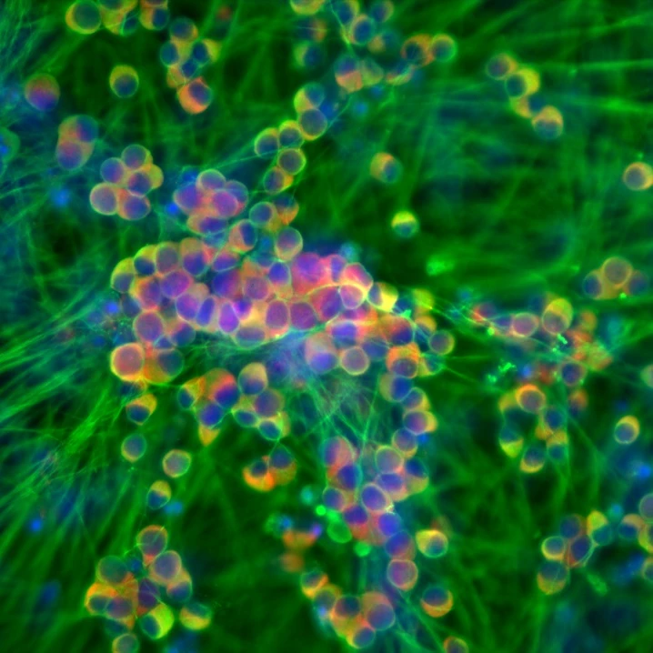 This is an image of a group of pain receptor neurons that was grown in culture from stem cells. The green marks the cell bodies and projections of the neurons (1). The blue represents the nucleus of each individual neuron (2). The red/pink is a marker of neuronal activity, showing which neurons were active when this image was created (3).