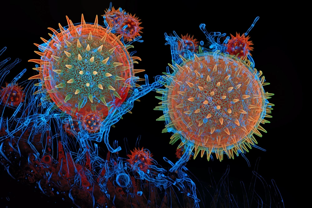 This is an image of several pollen grains infected with parasitic fungi sitting on the stigma of a mallow flower. The larger grains are from the mallow (1) and the smaller grains are from an aster flower (family Asteraceae; 2). The thin blue segmented strands wrapped around -- and even invading -- the pollen grains is a parasitic fungus, possibly from the genus Cladosporium or Alternaria (3). The larger blue and red tube-like structures are single-cell trichomes, or hairs, forming the sticky part of the stigma that the pollen is resting on (4). The colors you see in this image are produced by cellulose- and chitin-binding fluorescent dyes (Calcofluor White, and Congo Red). Autofluorescence (colors produced by when the laser from the microscope hits the sample) of the mallow pollen grain wall (sporoderm) is green.
